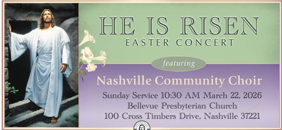 The Nashville Community Choir is an interfaith Christian community choir that was founded in 1985 by Norman and Marilyn Tolk, with Norm as conductor and Marilyn as accompanist. On the Tolks’ retirement in 2021, Michael and Pamela Runyan were chosen by the Tolks to succeed them. The choir performs four concerts each year, beginning with the Easter concert, “He Is Risen,” followed by a patriotic concert during the Memorial/Veterans Day celebrations, and finally two concerts at Christmas including Handel’s “The Messiah” and ”Think of that Night,” a collection of sacred and popular Christmas music. The choir has also been invited to perform in other concerts throughout the year. The choir welcomes new members who have a love of music. No auditions are required to join.